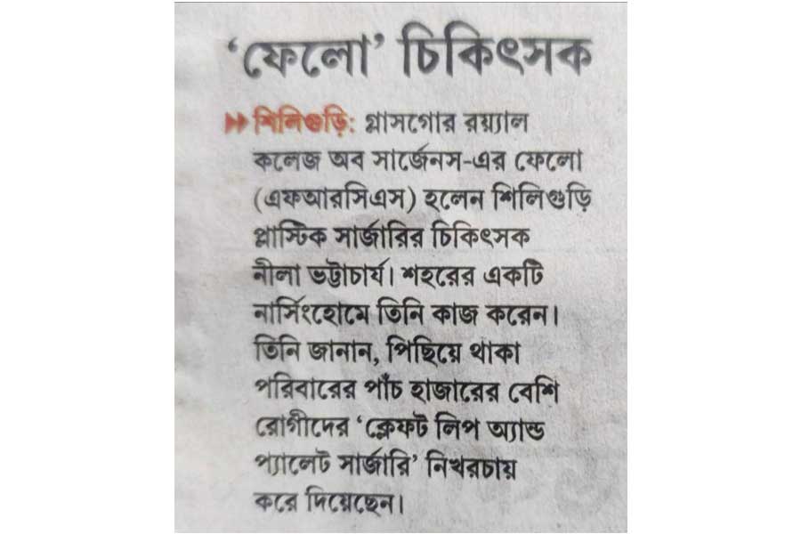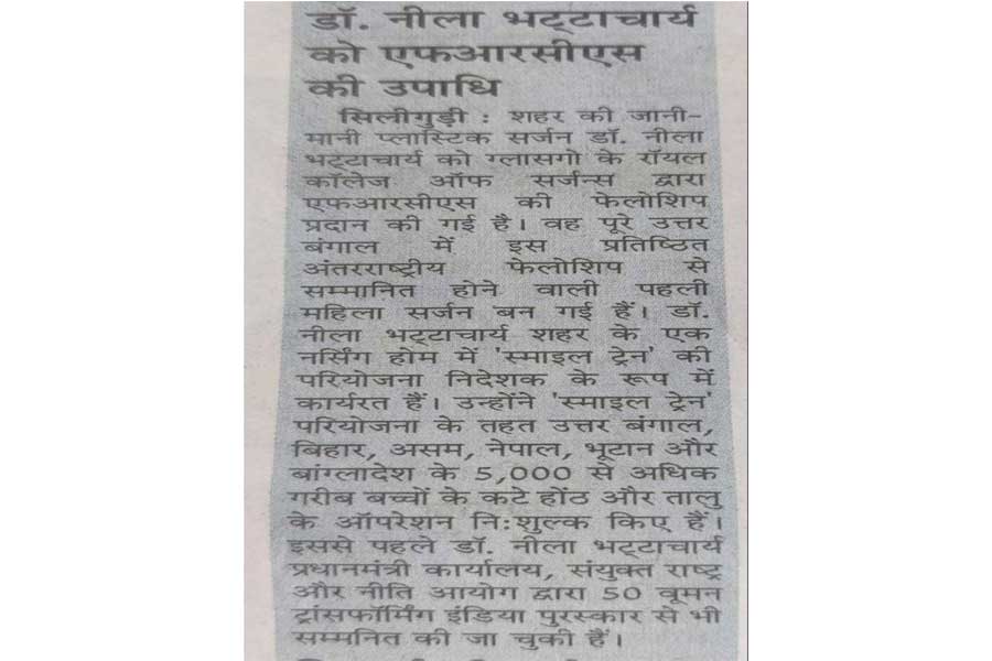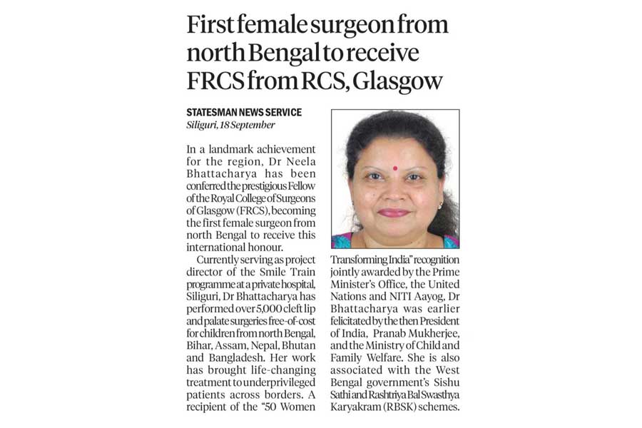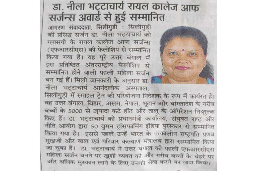 Dr. Neela Bhattacharya is a Plastic and Reconstructive from Chennai, Tamilnadu. She is the Project Director of Smile Train Program wherein she operates on infants and children with Congenital Cleft Lip and Palate totally free of cost. Over the last 15 years, she has restored smiles to more than 5000 such children from the Dooars, Darjeeling, Sikkim, Bhutan, Bihar and Nepal besides Siliguri and rest of North Bengal.